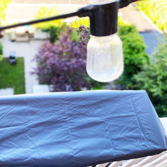 De hoes is gemaakt van polyester en is voorzien van elastiek zodat hij goed aansluit op jouw Balkonbar. Het materiaal wordt tweemaal gecoat aan de binnenkort. Deze coating zorgt ervoor dat de beschermhoes waterbestendig, vlam vertragend en protectie biedt tegen uv-straling."