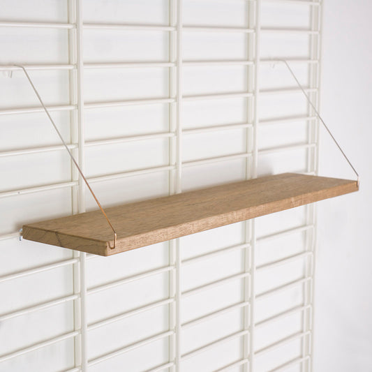 De plankjes kan je aan het rek hangen middels bijgeleverde ophanghaakjes. Deze haakjes zouden oorspronkelijk worden weggegooid in de fabriek waar ze gebruikt worden om te poedercoaten vandaar dat deze voor de helft met een kleur gecoat is. Wij hebben ze van de afvalbak gered en verzameld om ze te kunnen hergebruiken.
